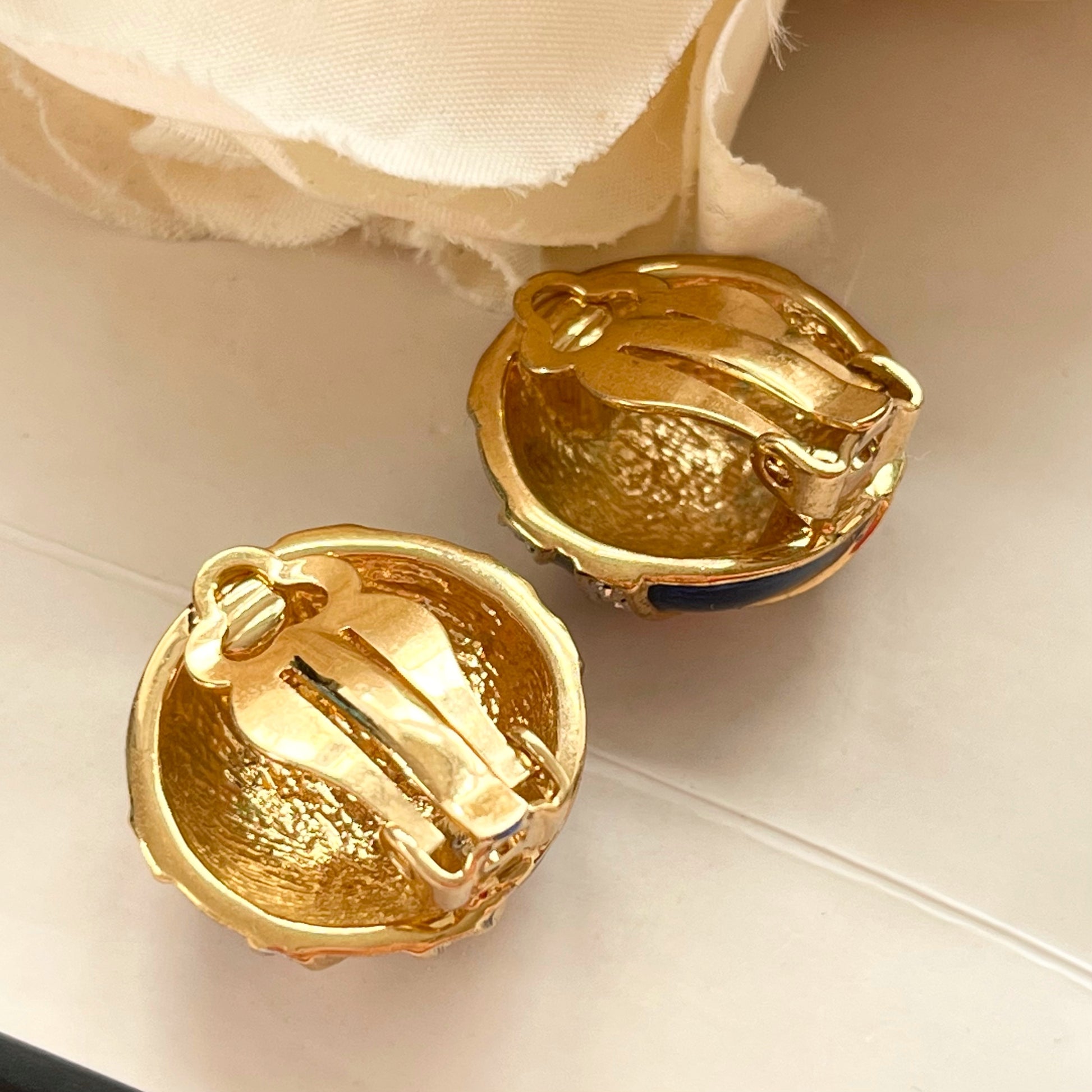 1980s Royal Blue Enamel Diamanté Gold Plated Circle Clip On Earrings
