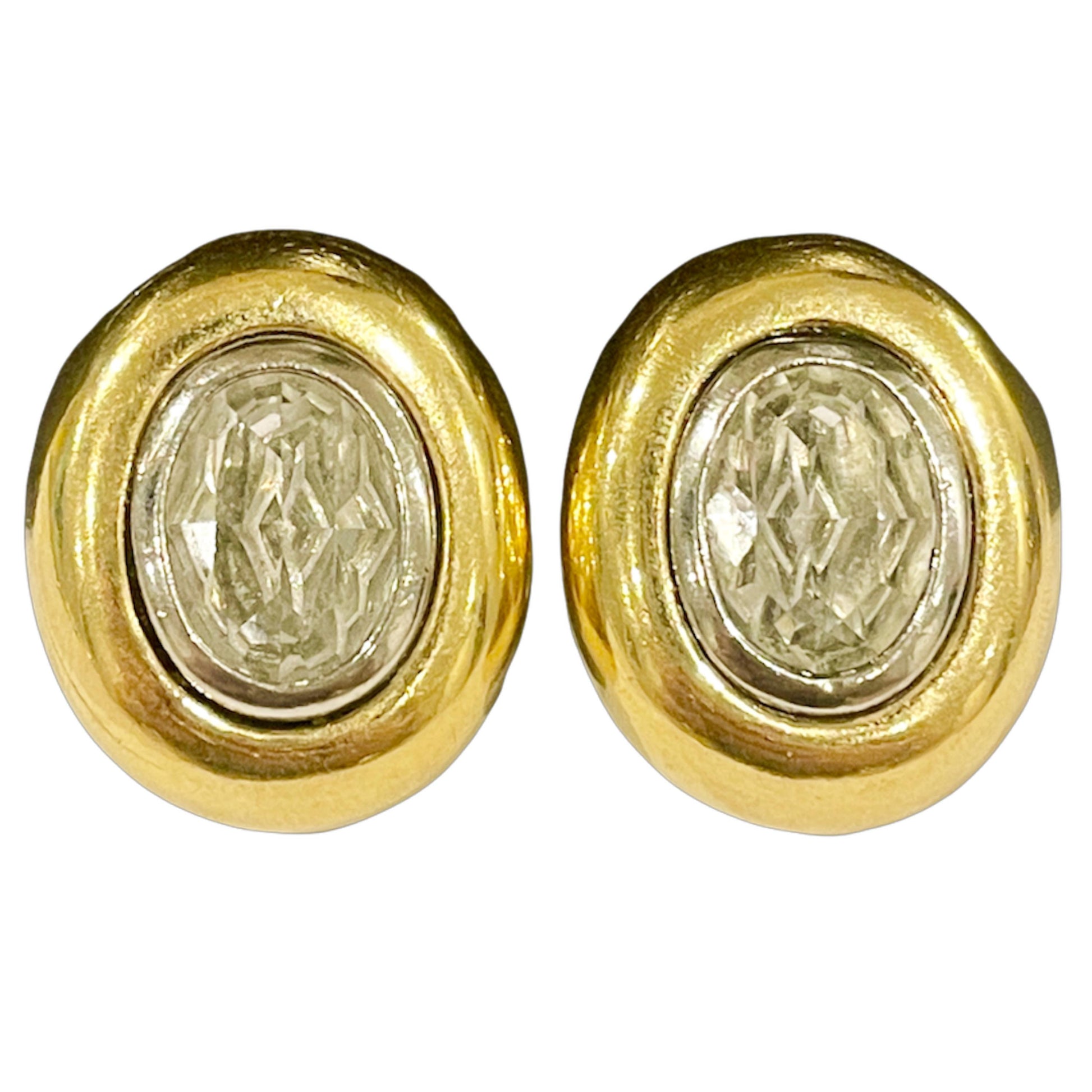 1980s YSL Gold Plated Sparkly Clip On Earrings, a true vintage treasure that exudes glamour and style. These clip on earrings are a stunning example of the high-quality craftsmanship that vintage YSL jewellery is renowned for. Crafted from lustrous gold plated metal these earrings feature a sparkling central diamanté. These earrings are comfortable to wear and suit all ears, even if they're not pierced. These power dressing earrings are incredibly versatile, making them perfect for a variety of occasions, from a casual day out to a more formal event. The earrings come complete with the signature YSL logo marked on the back, a testament to their authenticity and quality. They also come beautifully packaged, making them an ideal gift for a lover of signed vintage costume jewellery or a Yves Saint Laurent collector. (Does not come in original designer packaging unless stated otherwise.)