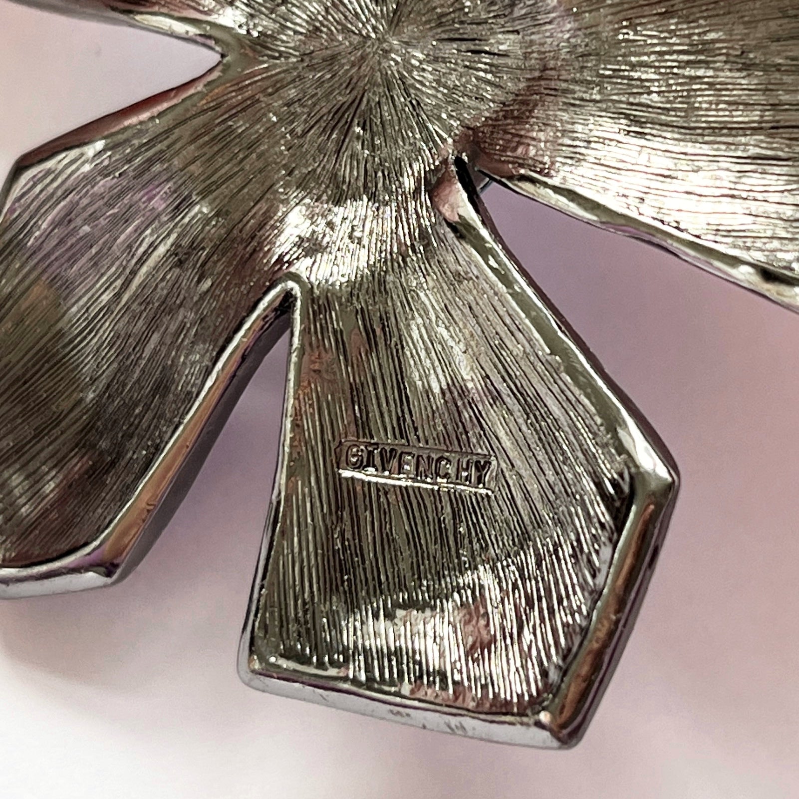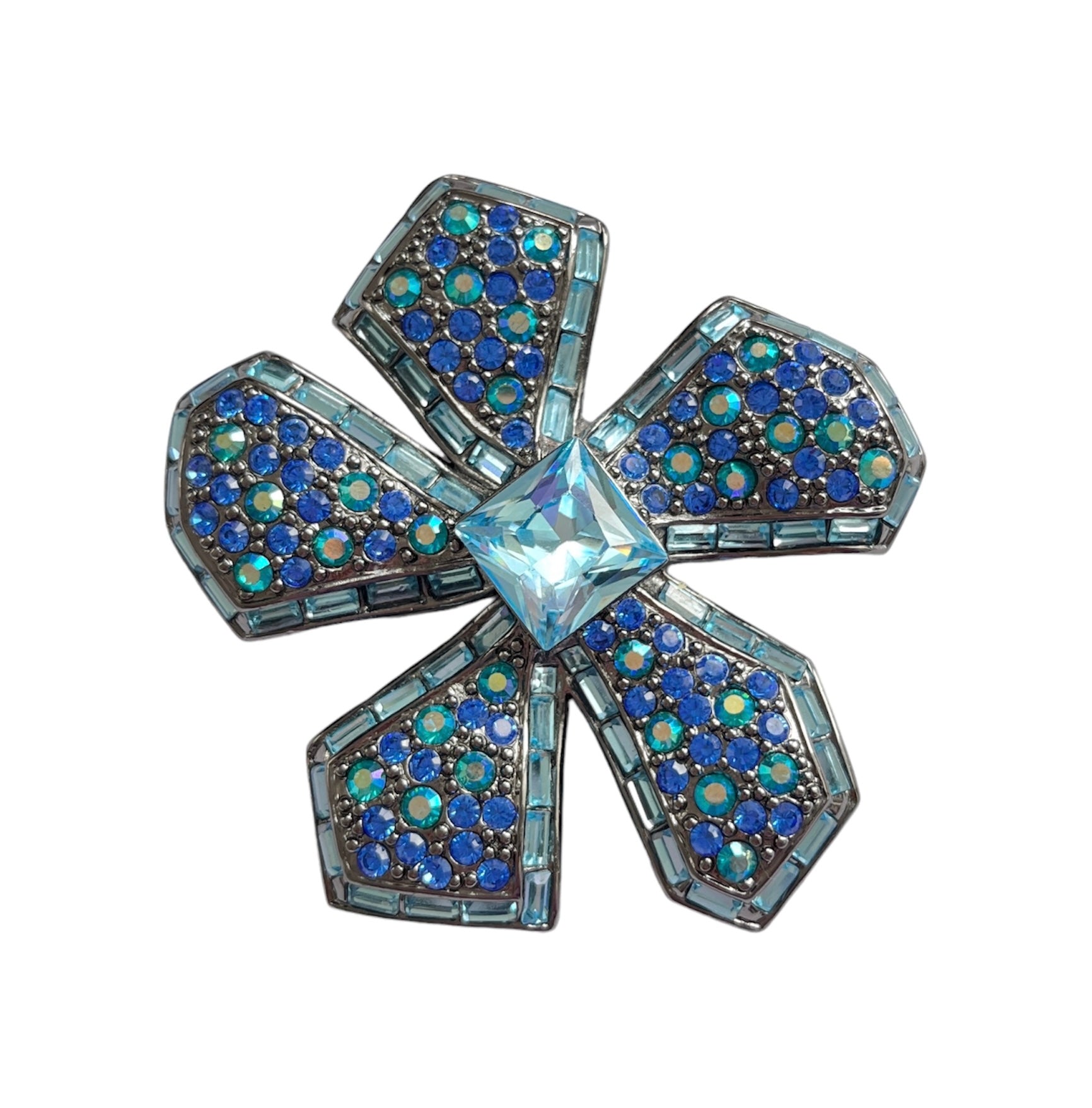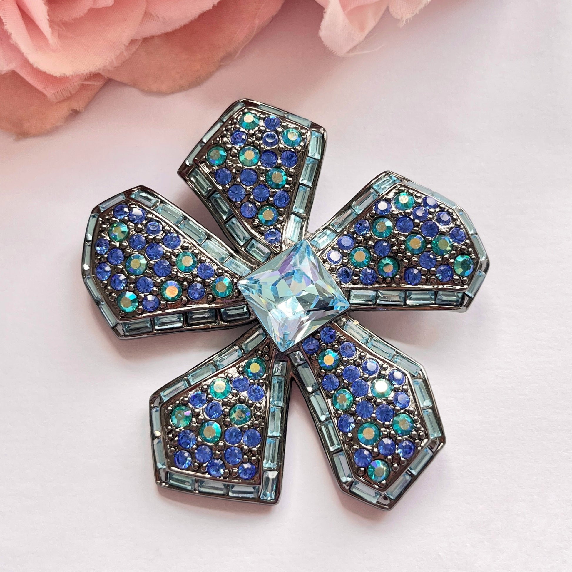 1990s Givenchy Blue Diamanté Flower Brooch. This statement brooch is a true vintage treasure. The dark silver tone brooch features a beautiful floral design finished with an array of blue paste stones and blue Aurora Borealis stones. Stamped with GIVENCHY on the back, a testament to its authenticity. This brooch features a rollover pin clasp so it sits safely on and comes beautifully presented in a Vintage Amara branded box, making it the perfect gift for a vintage costume jewellery lover. Items do not come in original branded packaging unless stated otherwise.