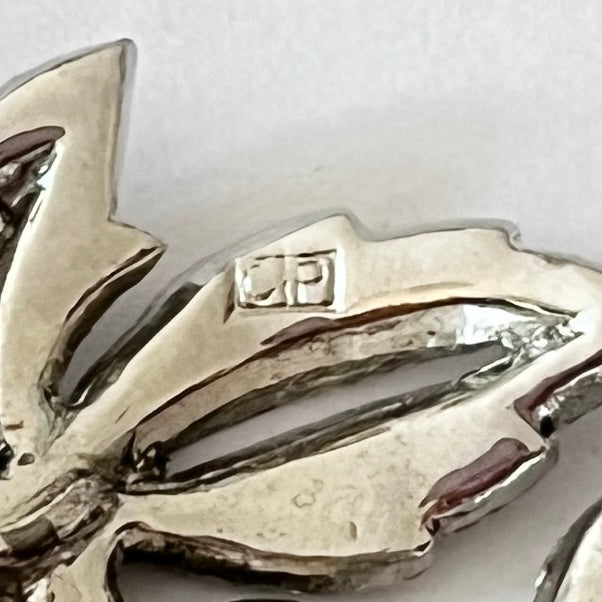 1950s CIRO Pearls Silver Paste Sparkly Leaf Brooch. A silver tone leaf brooch that’s vintage and lined with silver paste diamantés. Worn securely with it’s roll over pin clasp and marked ‘CP’.