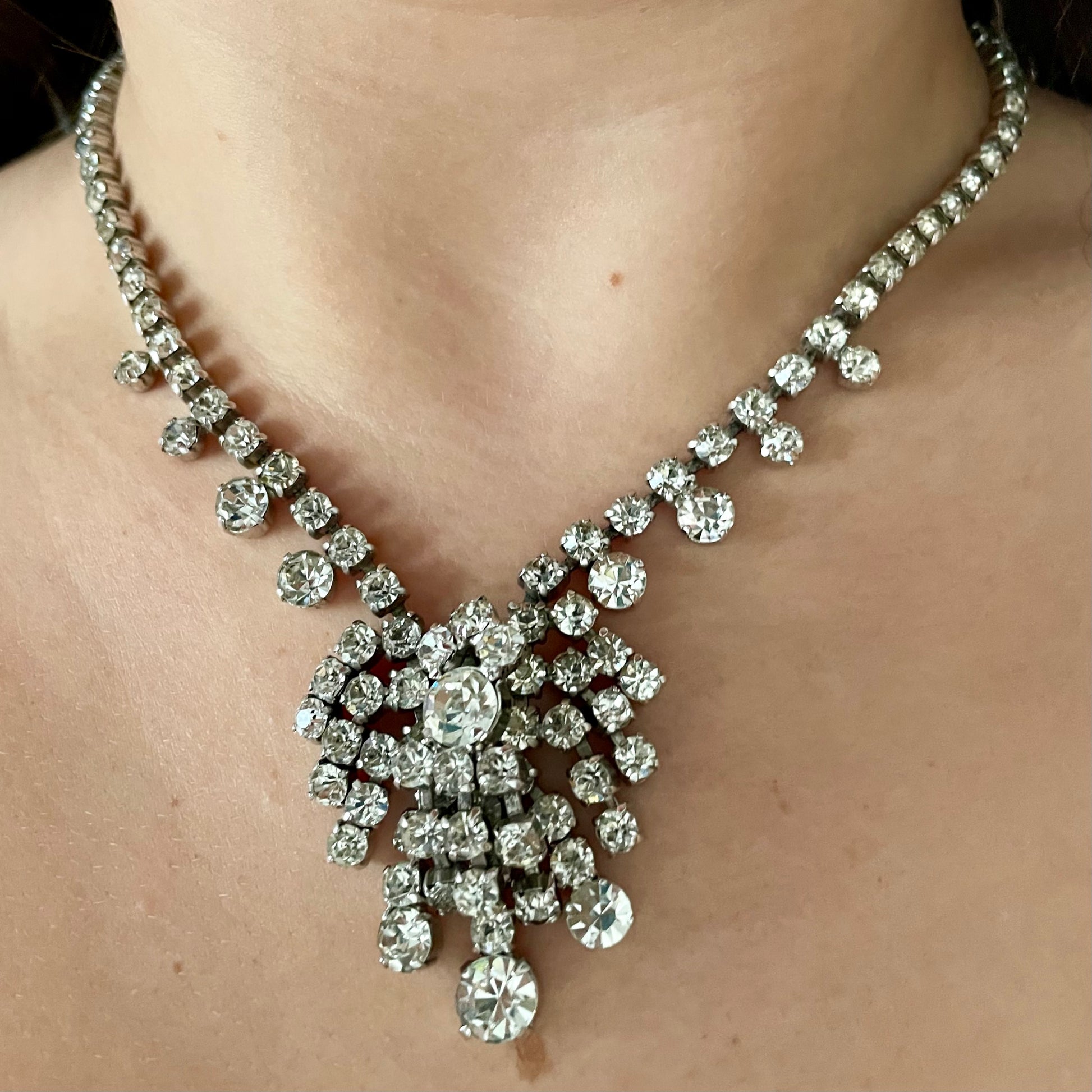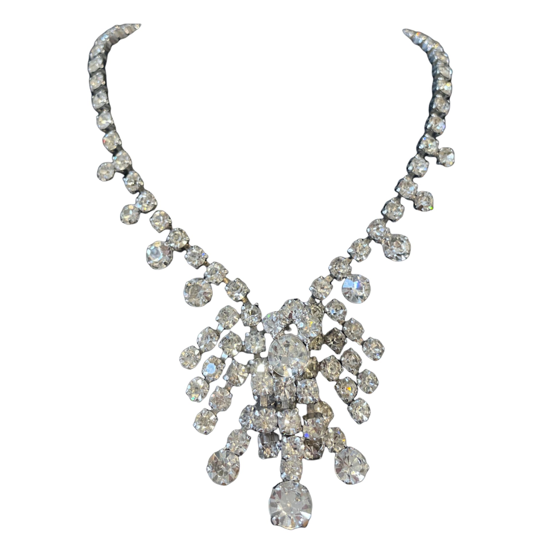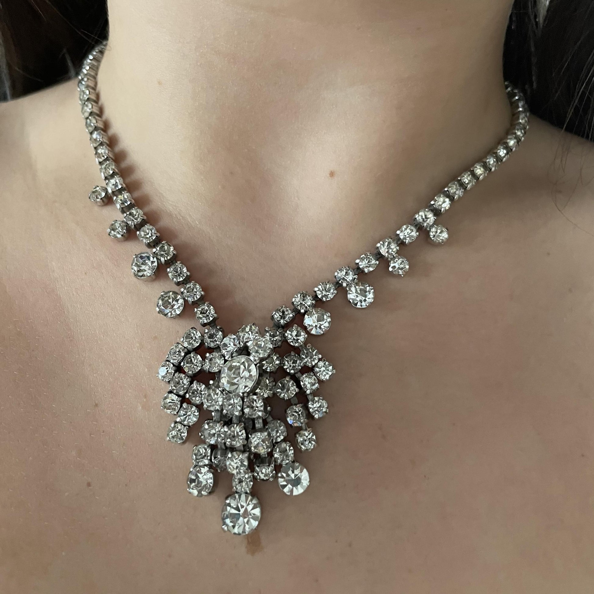 Sparkly 1950s Silver Toned Statement Necklace. A truly exquisite piece of vintage costume jewellery that will leave you feeling like a glamorous Hollywood starlet from a bygone era. This Marilyn Monroe esc necklace features a dazzling array of sparkling diamantés set on beautiful silver-toned metal with a gorgeous cluster pendant as a feature. The stunning stones catch the light in a mesmerising way, making this necklace the perfect accessory to add some vintage glamour to any outfit. The necklace sits securely on the neck with its lobster claw catch. This necklace is a true Old Hollywood statement piece that will turn heads and make you feel like the belle of the ball. Whether you're dressing up for a special occasion or looking for a unique gift you can’t buy twice, this necklace is perfect.