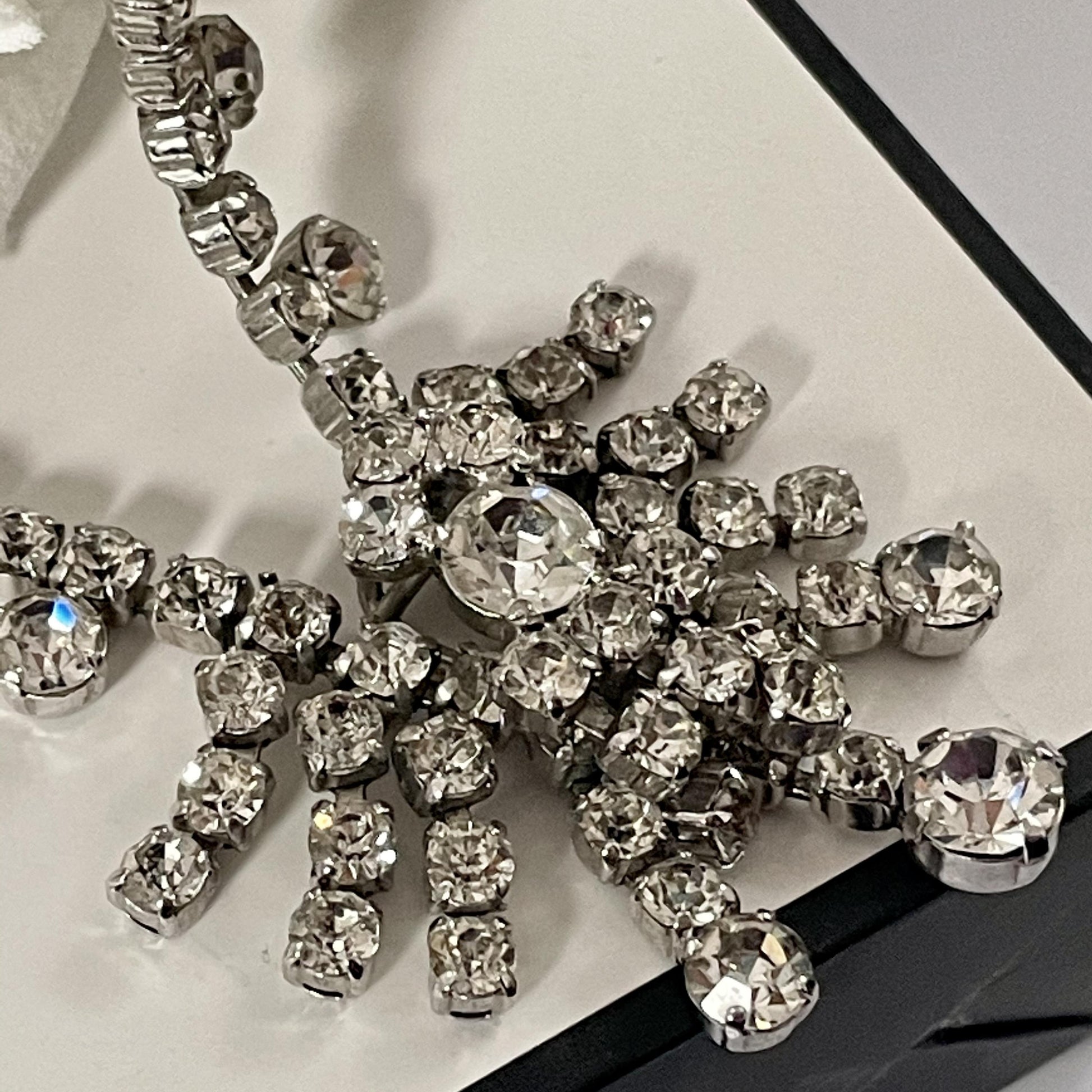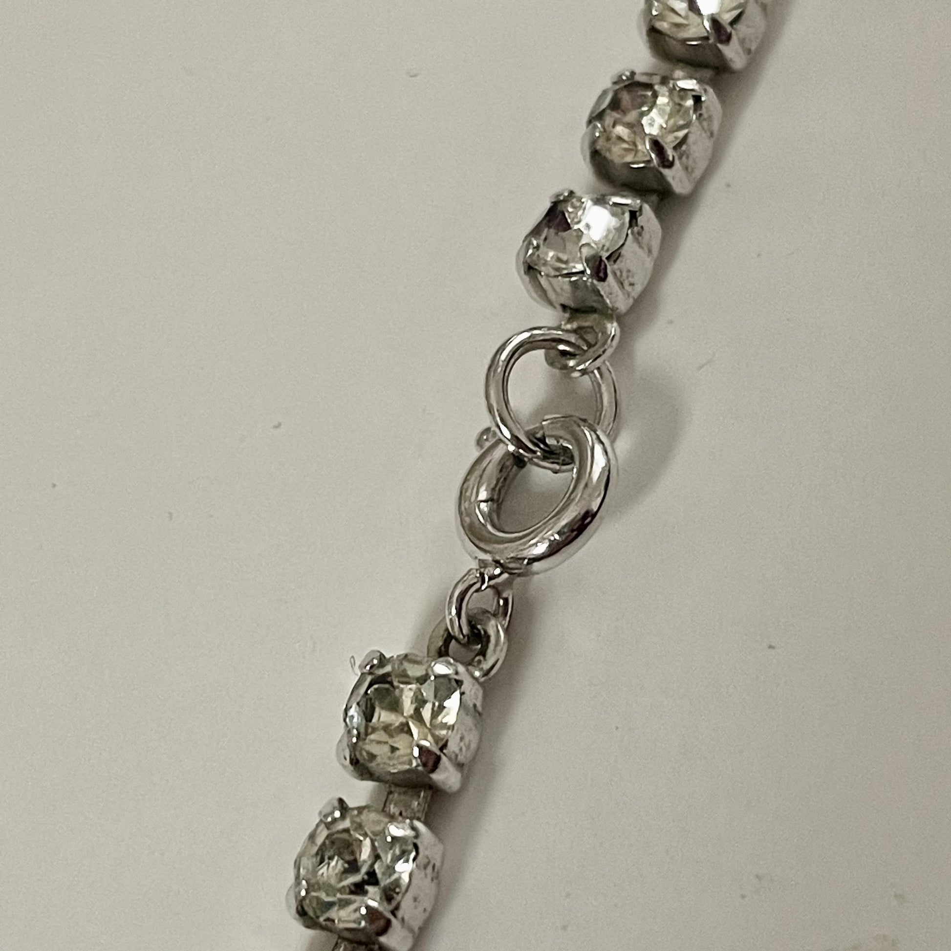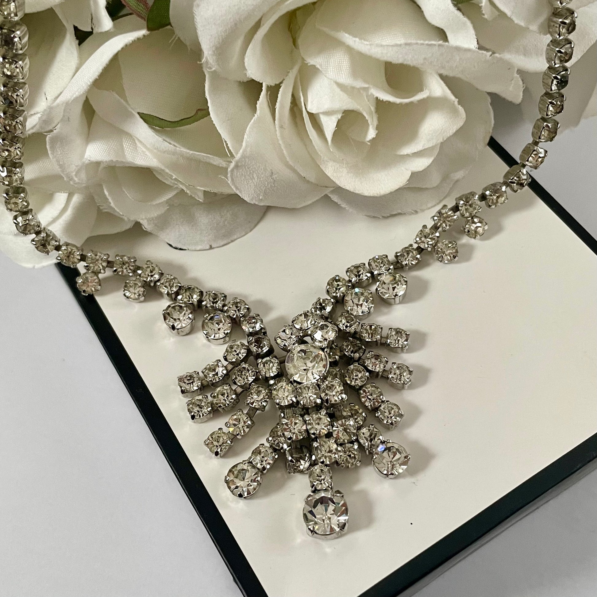 Sparkly 1950s Silver Toned Statement Necklace. A truly exquisite piece of vintage costume jewellery that will leave you feeling like a glamorous Hollywood starlet from a bygone era. This Marilyn Monroe esc necklace features a dazzling array of sparkling diamantés set on beautiful silver-toned metal with a gorgeous cluster pendant as a feature. The stunning stones catch the light in a mesmerising way, making this necklace the perfect accessory to add some vintage glamour to any outfit. The necklace sits securely on the neck with its lobster claw catch. This necklace is a true Old Hollywood statement piece that will turn heads and make you feel like the belle of the ball. Whether you're dressing up for a special occasion or looking for a unique gift you can’t buy twice, this necklace is perfect.