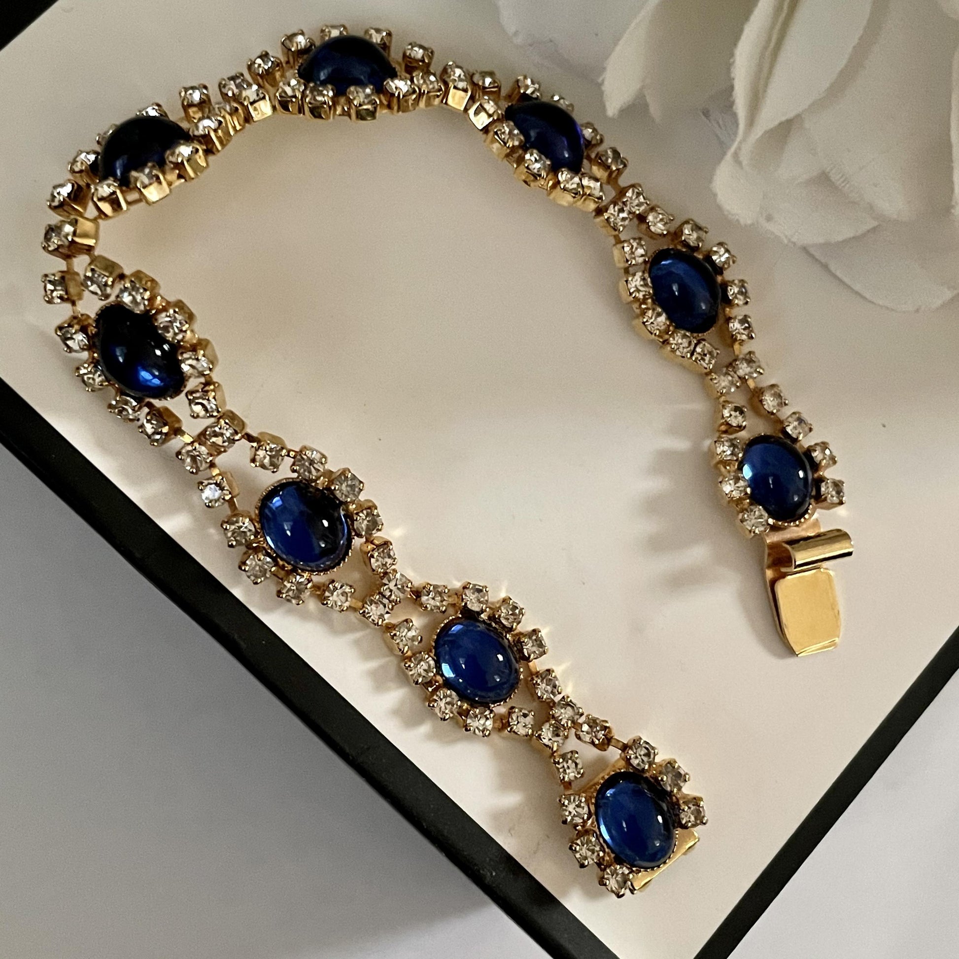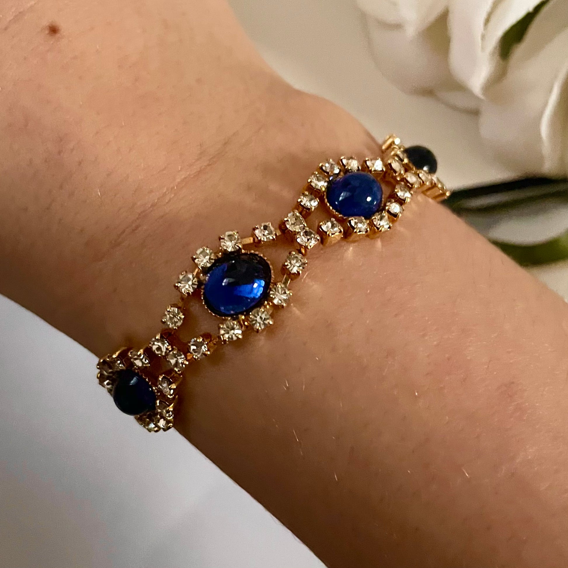 Sparkly 1980s Blue and Silver Diamanté Bracelet, a stunning piece of vintage costume jewellery that is sure to add a touch of glamour to any outfit. This bracelet is a beautiful example of the glamour that came in the power dressing era. Featuring a dazzling array of blue and silver diamanté stones set in a gold plated metal, this bracelet will make a statement. The stones catch the light beautifully, creating a sparkling effect that is sure to turn heads. This bracelet sits comfortably on the wrist with a secure box clasp that ensures your bracelet stays in place. Whether worn on its own or paired with other vintage pieces, this bracelet is sure to make an elegant statement and become a beloved addition to your vintage costume jewellery collection. It also makes for the perfect gift for any lover of sparkles!