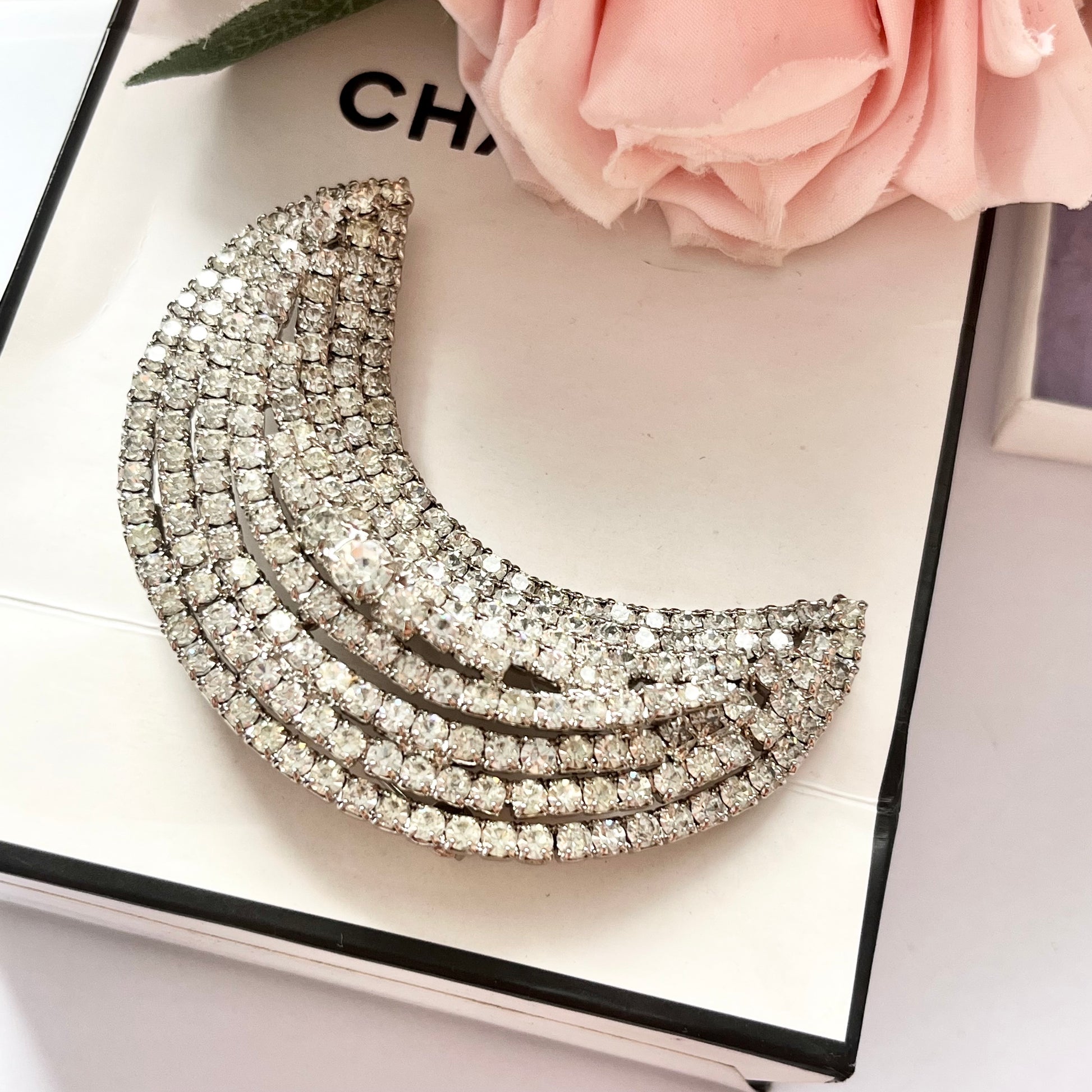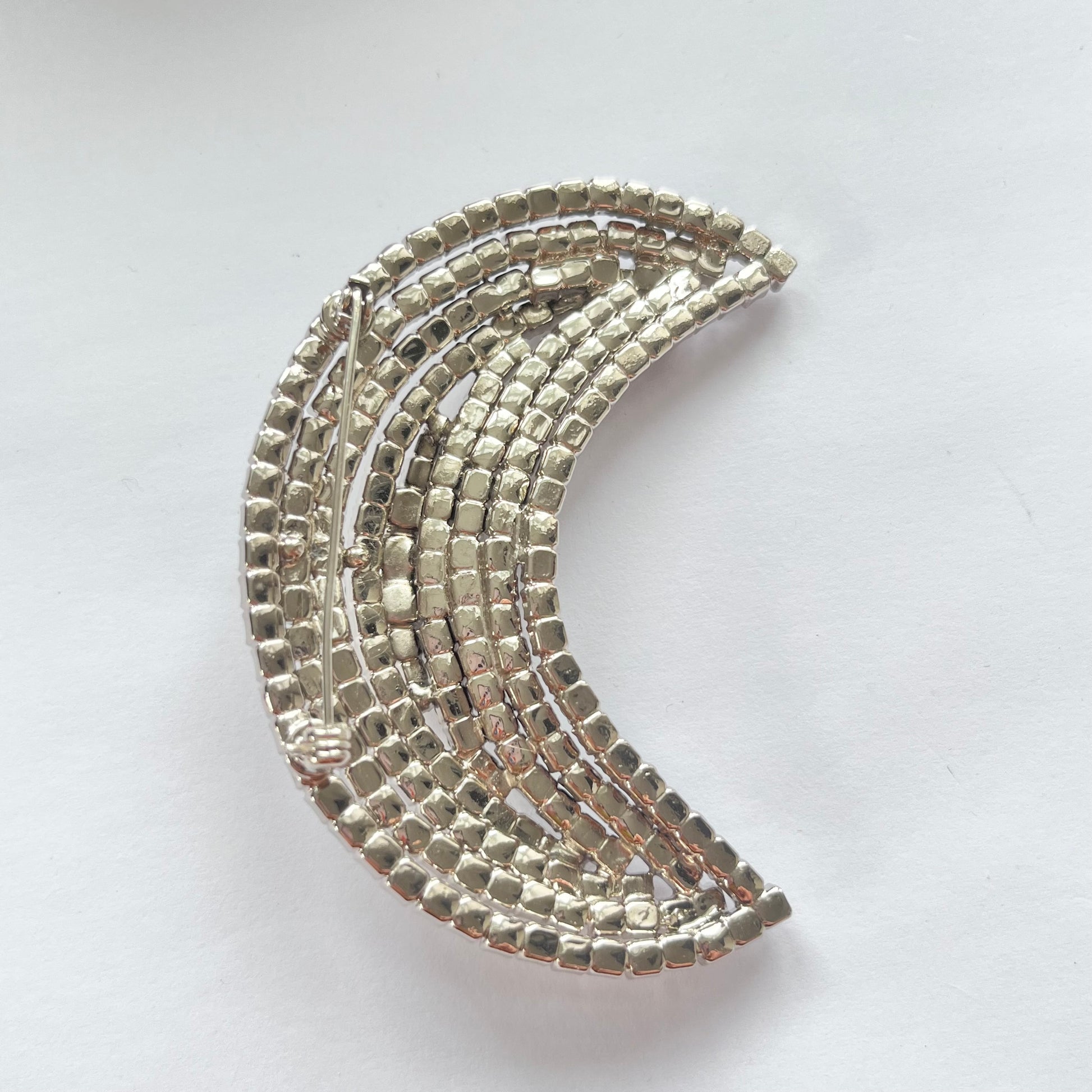 1950s Silver Tone Diamanté Crescent Moon Brooch