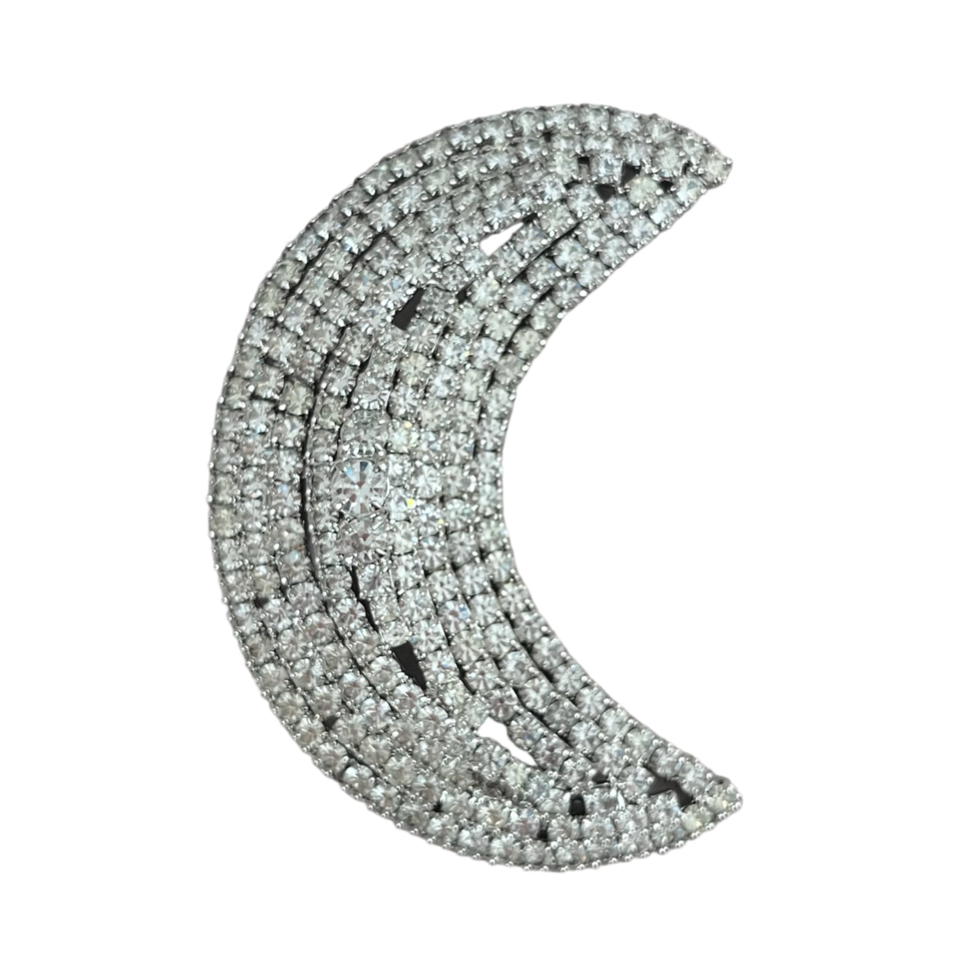 1950s Silver Tone Diamanté Crescent Moon Brooch. This stunning vintage piece is a true testament to the elegance and glamour of the pin up Old Hollywood 1950s era. Crafted with silver plated metal, this brooch is adorned with sparkling diamantés that capture and reflect light beautifully. With a secure roll-over pin and clasp. This celestial brooch is the perfect accessory to add a touch of vintage charm and glamour to any outfit. Whether you're dressing up for a special occasion, looking for a gift you can’t buy twice or adding a touch of sparkle to your everyday wear, this brooch is sure to make a statement.